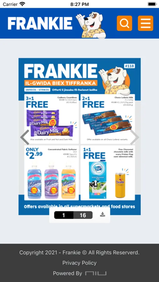 Frankie helps you with your daily or weekly shopping by finding great offers for you. Food, confectionary, personal care and detergents, all these and more are available from all leading supermarkets and grocery shops across Malta and Gozo. Frankie brings great brands to you offering value for money on your purchases.