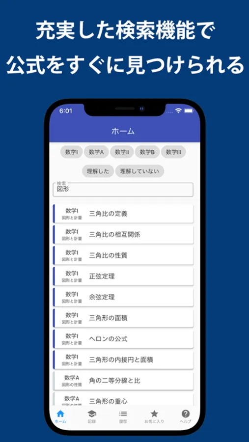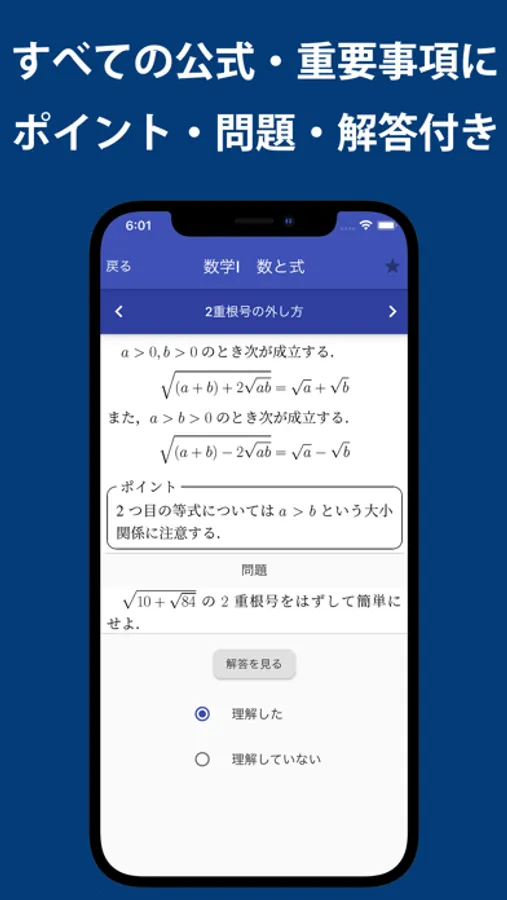 高校数学の重要事項をサクサクとスワイプして勉強できるアプリです。すべての重要事項にポイント・問題・解答がついています。