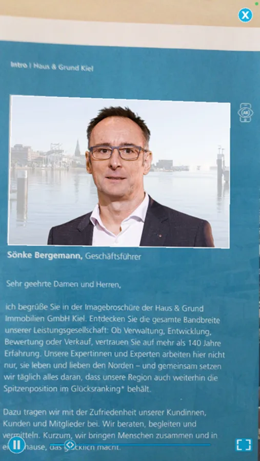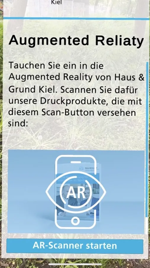 Die Haus & Grund Kiel App bringt Augmented Reality (= erweiterte Realität) im wahrsten Sinne des Wortes in vorbereitete Drucksachen (z. B. die Imagebroschüre 2021). Beim Scannen der Seiten werden auf dem Display multimediale Inhalte wie z. B. Filme, 3D-Illustrationen und Audio abgespielt, die so nicht in der Broschüre zu sehen sind. Erleben Sie die Zukunft auf dem eigenen Device! Des Weiteren haben Sie mit der App Zugang zu Neuigkeiten aus dem Verein und zu den wichtigsten Mieter-Informationen und -Unterlagen.