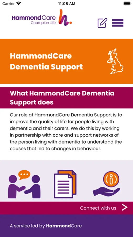 HammondCare Dementia Support is a dementia consultancy service which supports carers, and care and support teams, who work with people with dementia. The free Dementia Support app is your go-to source for real time support and practical resources to help you consider some of the causes of changing behaviour, and quick tips to respond to a range of situations.