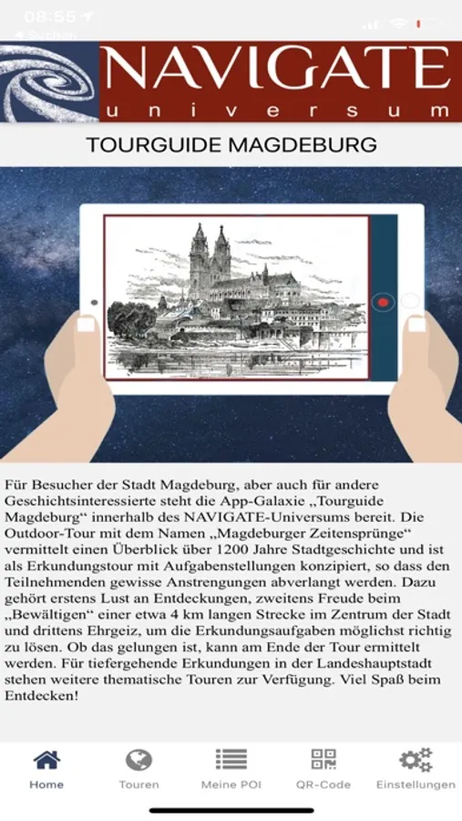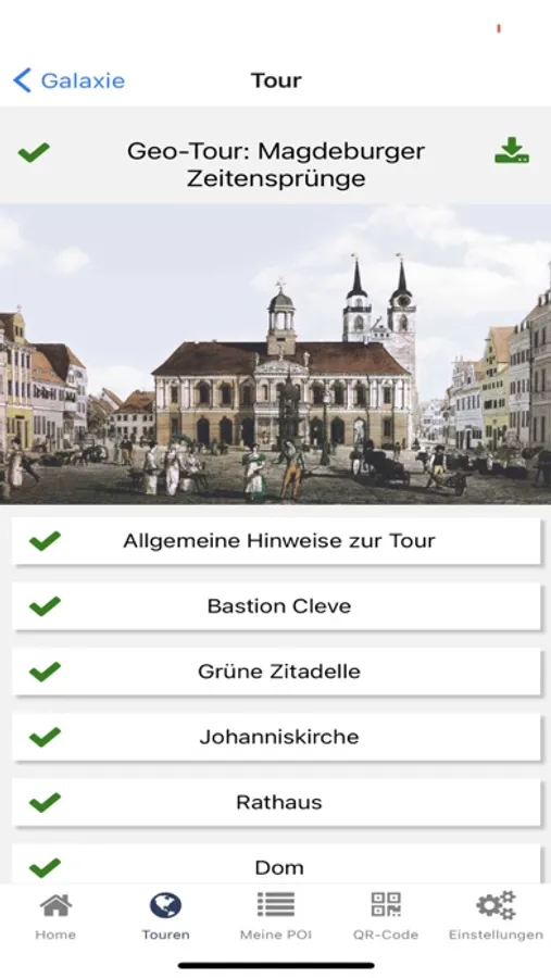 Für die Erkundung der Stadt Magdeburg stehen zwei Touren bzw. Module innerhalb der App-Galaxie „Tourguide Magdeburg“ zur Verfügung. Die Tour „Magdeburger Zeitensprünge“ richtet sich vor allem an Touristen mit Interesse für die Stadtgeschichte und die Tour „Heutige Orte auf alten Bildern“ ist gedacht für heimatverbundene Besucher mit Interesse für den Wandel der Stadt in den letzten Jahrhunderten.