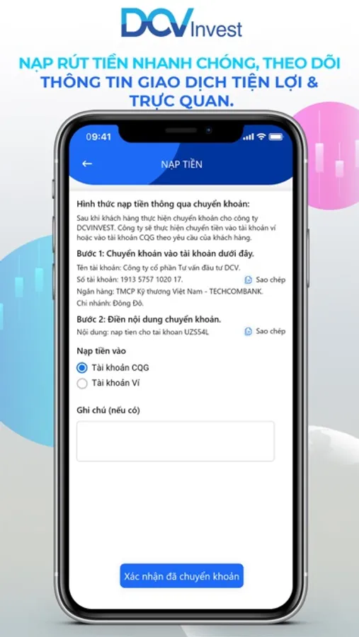 Với nhiều năm kinh nghiệm trên thị trường tài chính, DCV Invest đã giúp các nhà đầu tư Cá nhân, Doanh nghiệp tiếp cận với hàng trăm thị trường toàn cầu. DCV Invest là một công ty fintech với các giá trị cốt lõi là uy tín, công nghệ hiện đại và dịch vụ hỗ trợ nhanh chóng."