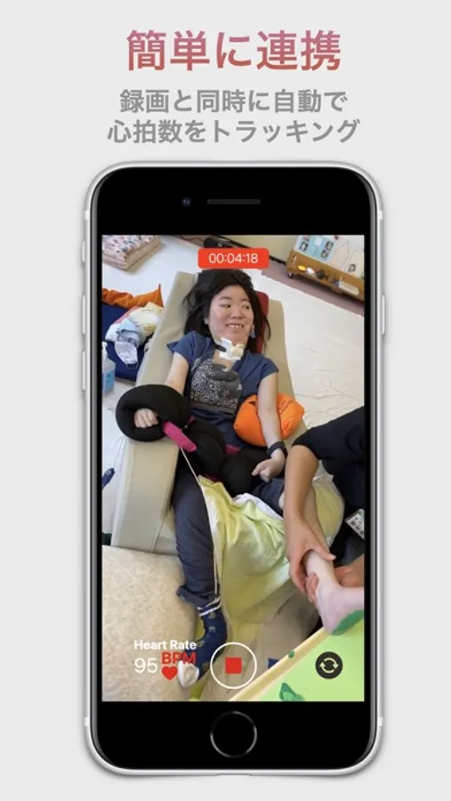 iPhoneで録画を開始すると、それがトリガーとなり、Apple Watchでの心拍数の計測及び、HealthKitからの心拍数取得が自動で開始されます。取得された心拍数は、録画中のビデオ映像と合わせて、iPhoneの画面にリアルタイムで表示され、アプリの利用者が確認することができます。コミュニケーションが難しい方の心拍数を把握する場合、当事者にApple Watchをつけてもらい、保護者、介護者、教師がiPhoneで録画を開始します。