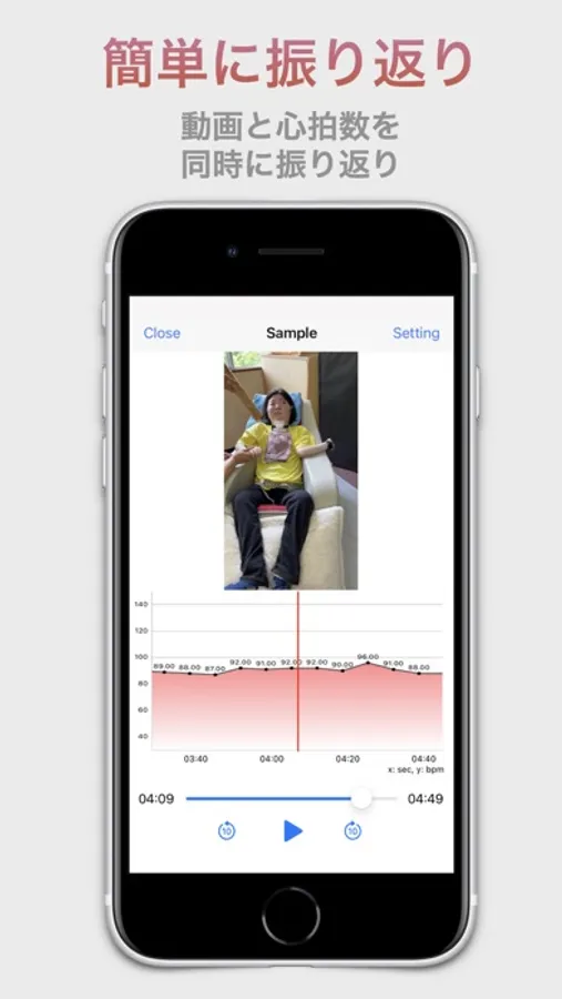 iPhoneに保存されたデータ(ビデオ映像と心拍数)は、心拍数が折れ線グラフとして表示され、ビデオ映像と共に、その時刻を同期して確認(つまり、再生)することができます。この機能により、その時の振る舞いなどの様子を後日振り返り、活動と心拍数の関係性を理解することができます。