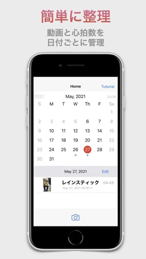 録画終了後は、Apple Watchでの心拍数の取得が自動で終了し、録画したビデオ映像と心拍数のデータが、iPhoneに保存されます。保存データには、アプリの利用者が任意の名前をつけることができます。また、データは、本アプリに搭載したカレンダーに基づいて管理されます。