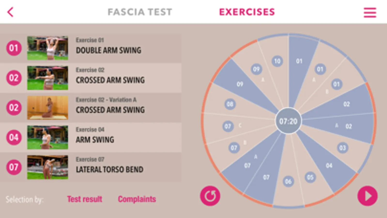 The fascial swing movements can be acquired by in-app sales. Get your individual training mix according to the test results. It consists of exercises for your imbalances and further swing movements that help you in maintaining your fascial health and fitness. Alternatively, you can have the workout designed according to your limitations or complaints, such as headaches or neck pain. The workout takes round about 10 minutes and can be done anywhere.