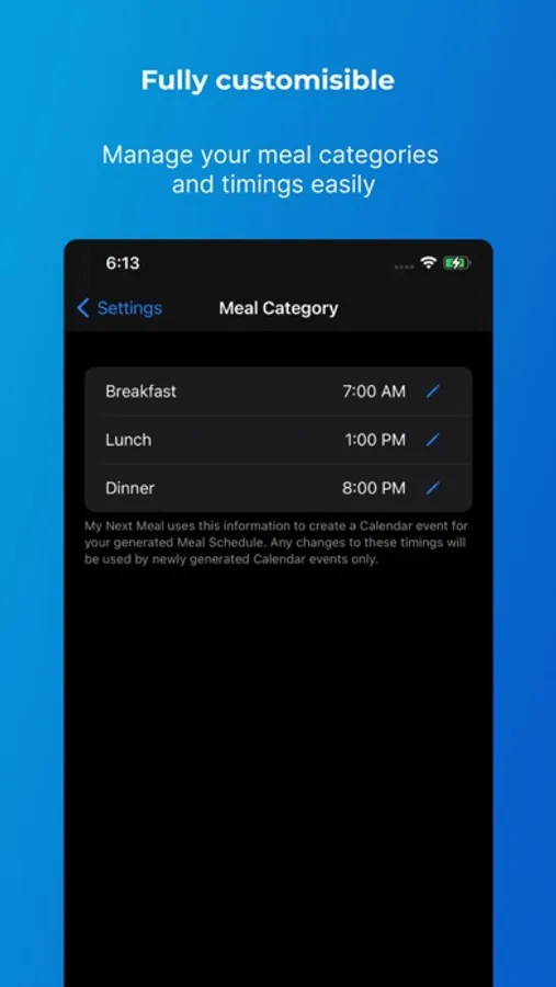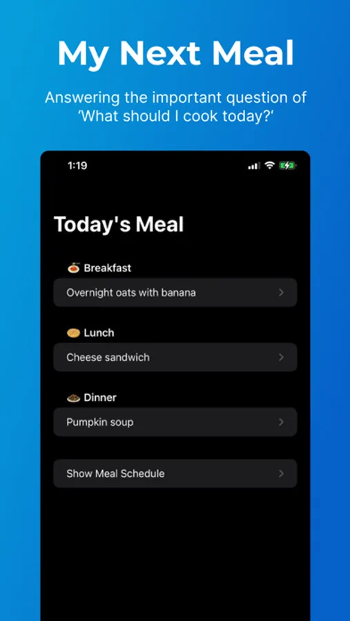- It generates a Meal Schedule for you based on the meals you have entered,