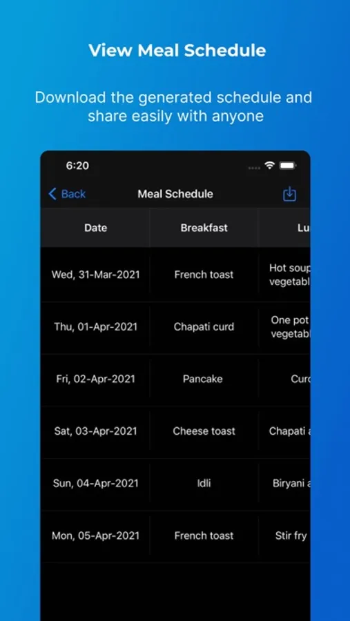 - Export Meal Schedule: You can download the generated schedule to your Files, share it with family or friends, and use it while going your meal grocery shopping.