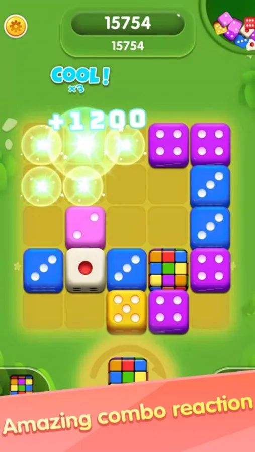 Three 6 dots dice can be merged to a jewel cube dice. It's a magic dice. Merge three jewel dice can crush 3x3 nearby dices.