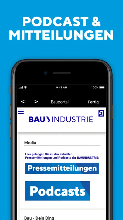 Die BAUINDUSTRIE APP ermöglicht es Ihnen, sich zu neuen Podcasts und Social Media per Mitteilung benachrichtigen zu lassen.