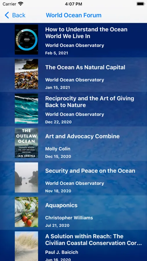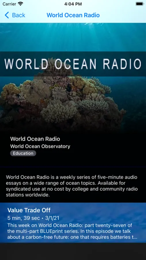 - Listen to weekly episodes of WORLD OCEAN RADIO, our 5-minute audio feature on a wide range of ocean issues from science and education to advocacy and exemplary projects, brought to you by long-time host Peter Neill.