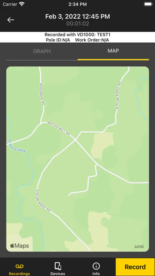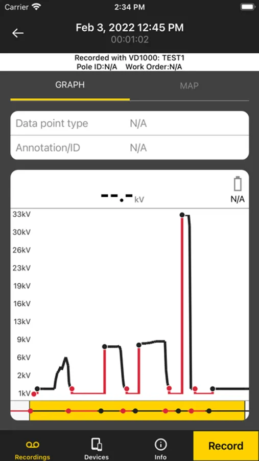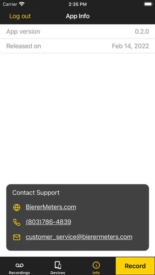 The Bierer Voltage Recorder App has the capability to communicate via wireless communication to a VD1000 series meter and take live recordings. As the VD1000 meter functions normally, the communication board translates the reading of the meter and makes it available to be seen on the Bierer Voltage Recorder App. All functions of the VD1000 meter can be seen on the App which includes: The mode, battery voltage, and the voltage reading. The Bierer Voltage Recorder App also has other features that include saving recordings, viewing recordings, adding annotations to recordings, sharing recordings, and a map view of the location in which the recording took place.