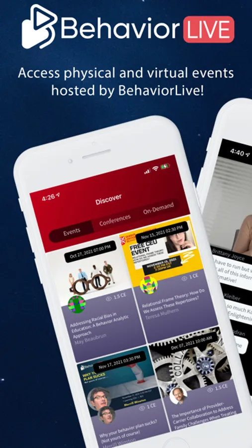 Introducing the BehaviorLive app! A seamless experience for live events and CEUs. Users of the app can participate in conferences & events virtually and physically! If you are on-site, scan the QR code to check into an event, and then join the "virtual" room to connect with your online peers and chat, ask questions, answer polls and much more during the sessions. A fully immersive experience for live events!