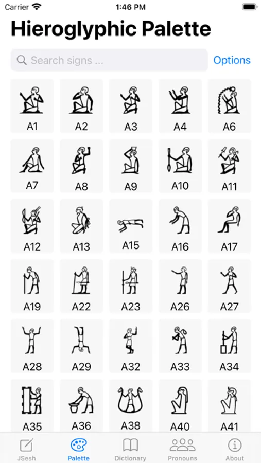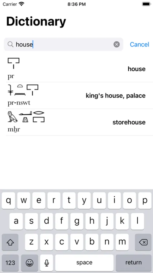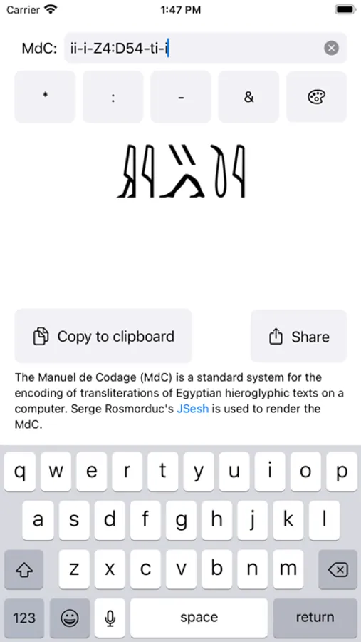 This app provides several tools to help you read and write Middle Egyptian texts. The app renders Manuel de Codage (MdC) into hieroglyphs using Serge Rosmorduc's JSesh. The app also allows you to browse JSesh's hieroglyphic palette. It further includes lessons and quizzes that help you learn to read Egyptian. Furthermore, a 1000 word dictionary with a search function, and a list of personal and demonstrative pronouns are included. The app support multiple transcription styles including the European system, the British system, the Budge system, and the computer system. The name of the app r n kmt is Middle Egyptian and means "speech of Egypt".