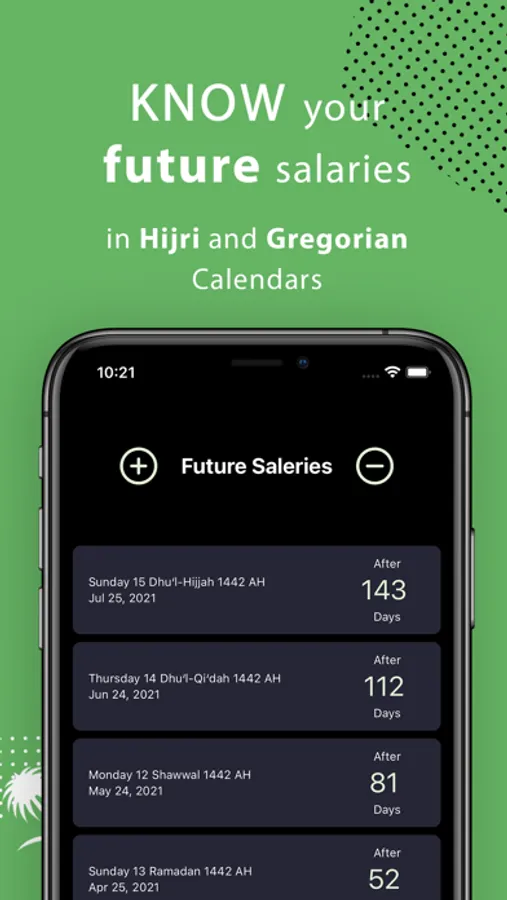 This tool is useful for keeping track of future salary dates in both Gregorian and Hijri calendars, as well as monthly tax returns (aka citizen's account).