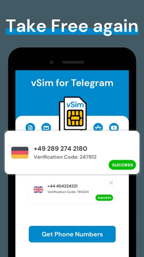 • Virtual Numbers App provides numbers from over 100 countries, but if you don't have a local phone number for your country, you can still get a US number or any other number and activate a Telegram account!