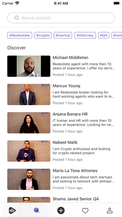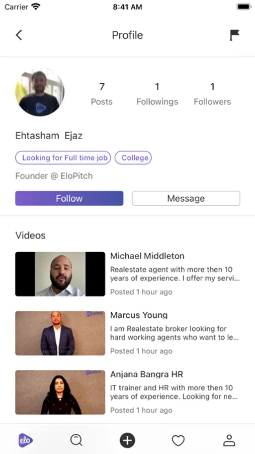 In today’s high-tech and high-paced world, almost every industry is being upgraded due mostly to accessibility through modern web apps and mobile applications. The recruitment industry has yet to see that upgrade. That’s where eloPitch comes in, Our goal is to create a mobile application that allows job seekers to offer a 60-second “elevator” pitch about themselves which can be viewed directly by recruiters. Each video will have metadata (tags) associated with it to allow it to appear in the correct category and search result when searched for by recruiters.