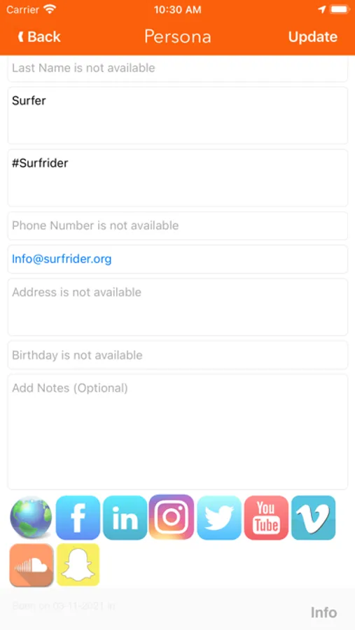 This app helps you create *Personas* to leverage your personal brands, by providing the configuration of digital social media profiles (web site, Facebook, Linkedin, Instagram, Twitter, Youtube, Vimeo, Soundcloud, Snapchat), specifically per *Persona*, that can be shared with others to reach your market and fan based potential.