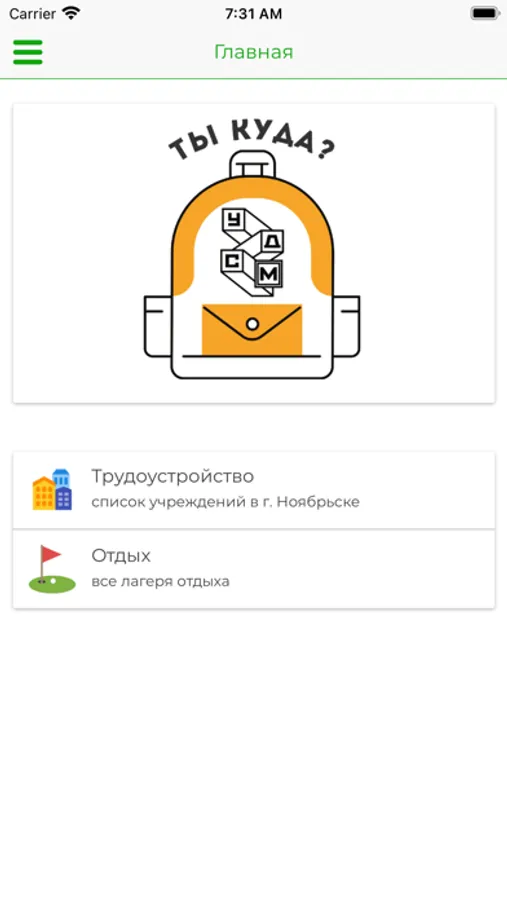 Ты куда? - это приложение для информирование населения города об организации отдыха и трудовой занятости несовершеннолетних муниципального образования город Ноябрьск. Тут вы можете увидеть актуальные детские оздоровительные лагеря и смены трудоустройства для несовершеннолетних в городе Ноябрьск, а так же подписаться на push-уведомления для получения новостей по интересующим Вас категориям.