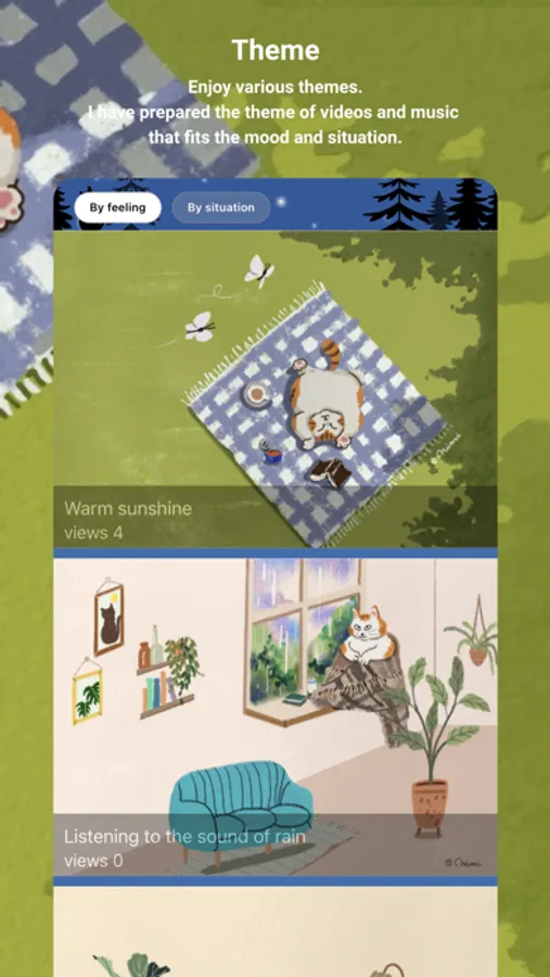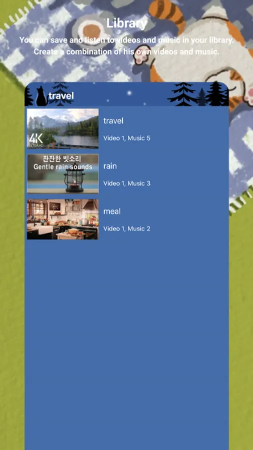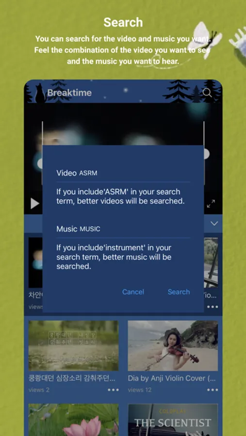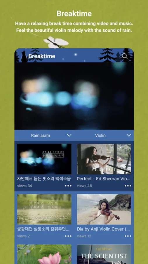 - rain, fire, nature, cuisine, mountain, river, sea image and guitar, violin, viola, pelo, gayageum, daegeum, haegeum, flute, trumpet, saxophone, oboe, panplot, clarinet, ocarina, piano, kalimba, With the music of drums, marimba, a cappella, ensemble, and OST, you can relax and heal your mind.