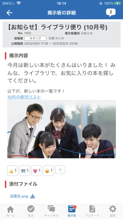 ・学校やクラスなどからの各種お知らせ、連絡事項の掲示板です。