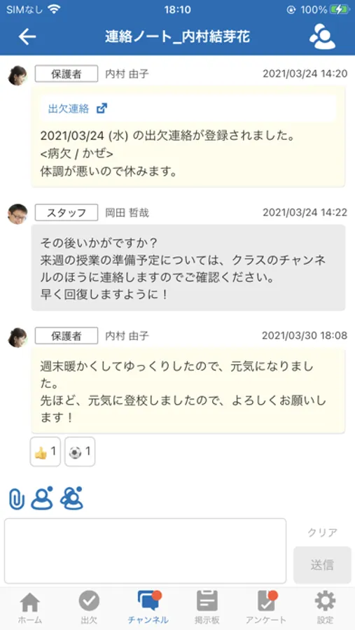 ・保護者とスタッフの「連絡ノート」や、クラス、部活動のチャンネルなど、チャット形式のコミュニケーションチャンネルです。