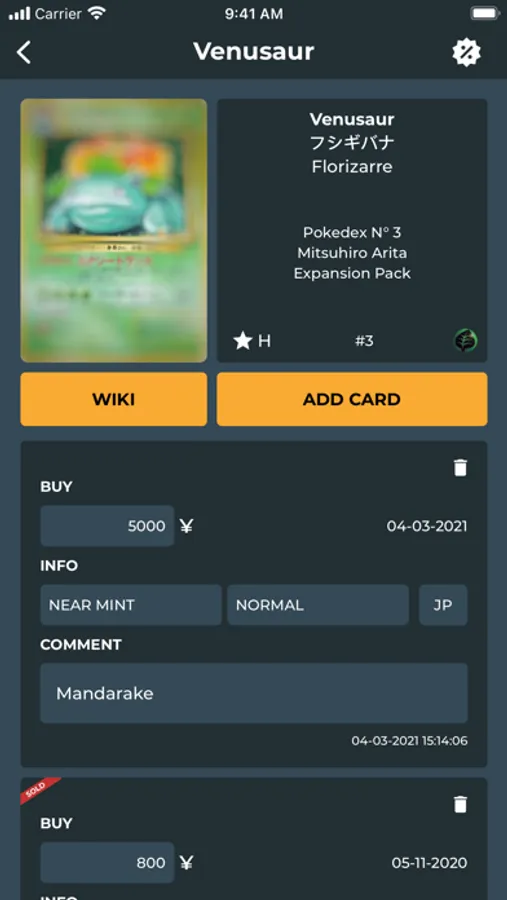 Detailed management of your cards and sealed items collection: version, condition, purchase price, purchase date, grading note and more.