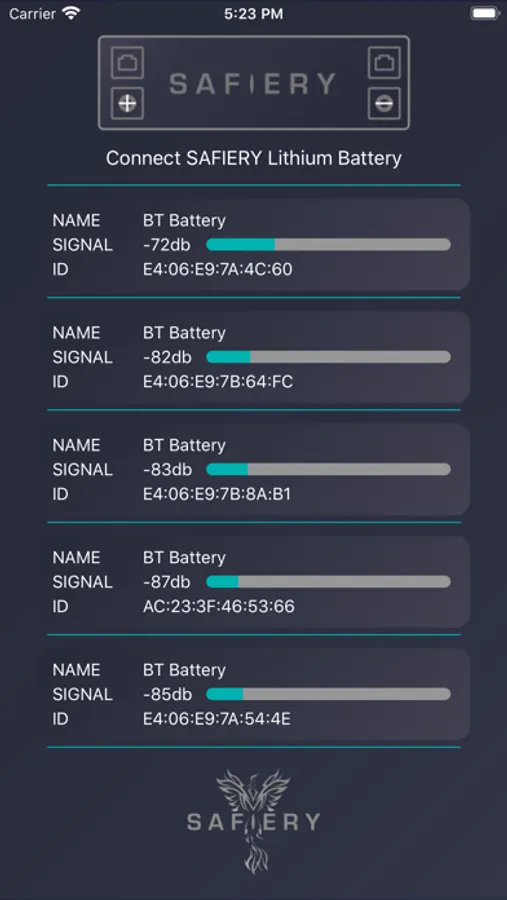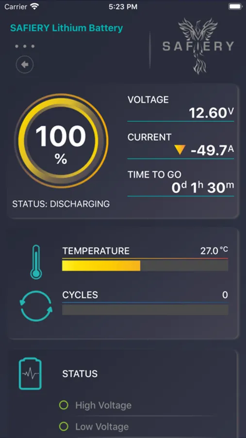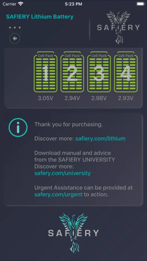 SAFIERY Smart Lithium app shows both the essential data and detailed diagnostic data in the one app. Key essential data is State of Charge, Voltage, Time to Go and Battery Health. Detailed diagnostic data includes cell voltages and alarms. The Notification pages time stamps alarms. There is a link to urgent support.