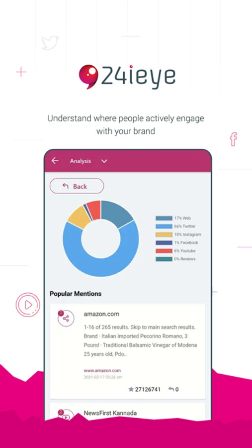 24ieye app is a great option to track and analyze how news and social media think, track the source of contents and insights anywhere from the globe, to get a better understanding of who is talking about the brand online, and to analyze buzz quality and quantity to gain new insights about the customers.