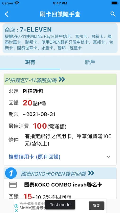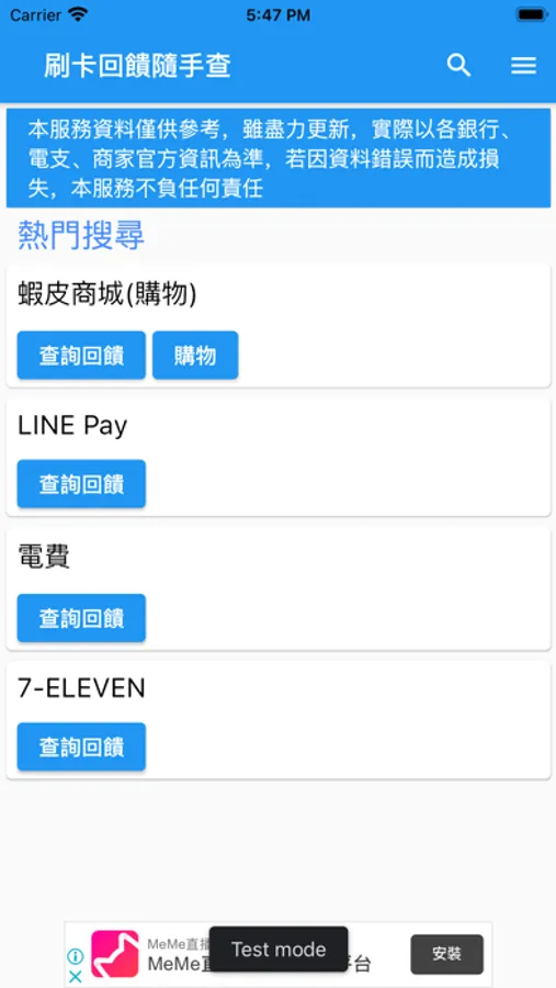 免費快速搜尋商店的台灣信用卡最佳消費回饋,查詢在商店消費時,刷卡的最佳選擇,包含信用卡綁定於電子支付,可搜尋經常消費的商店,找出適合自己的高回饋信用卡。