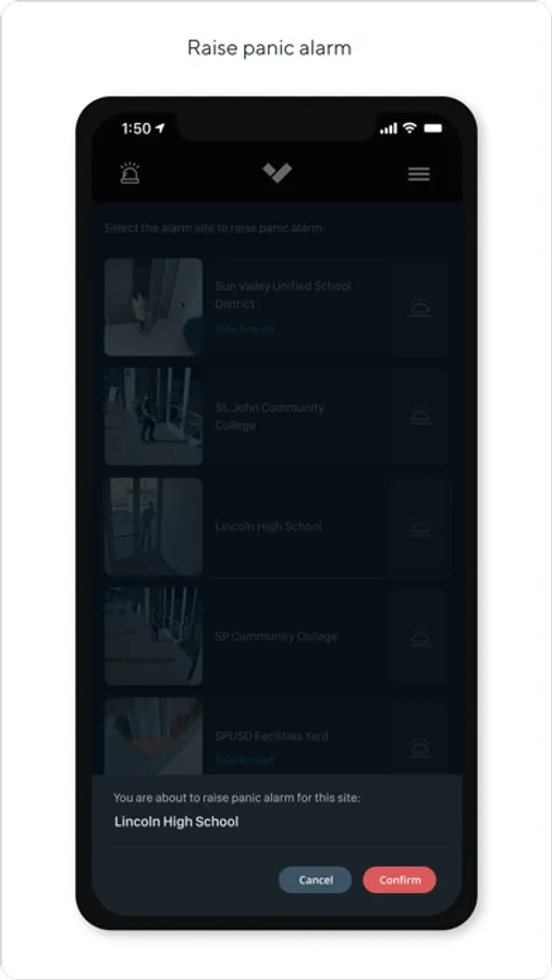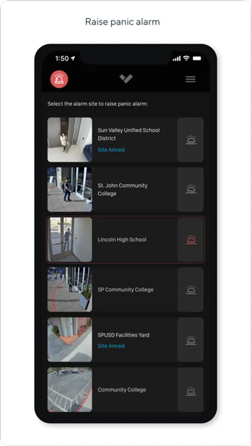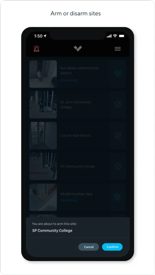 The Verkada Alarms app allows for easy arming and disarming of sites across your organization, and includes a digital panic button to raise alarms and dispatch emergency services.