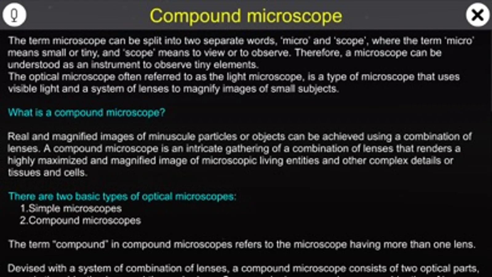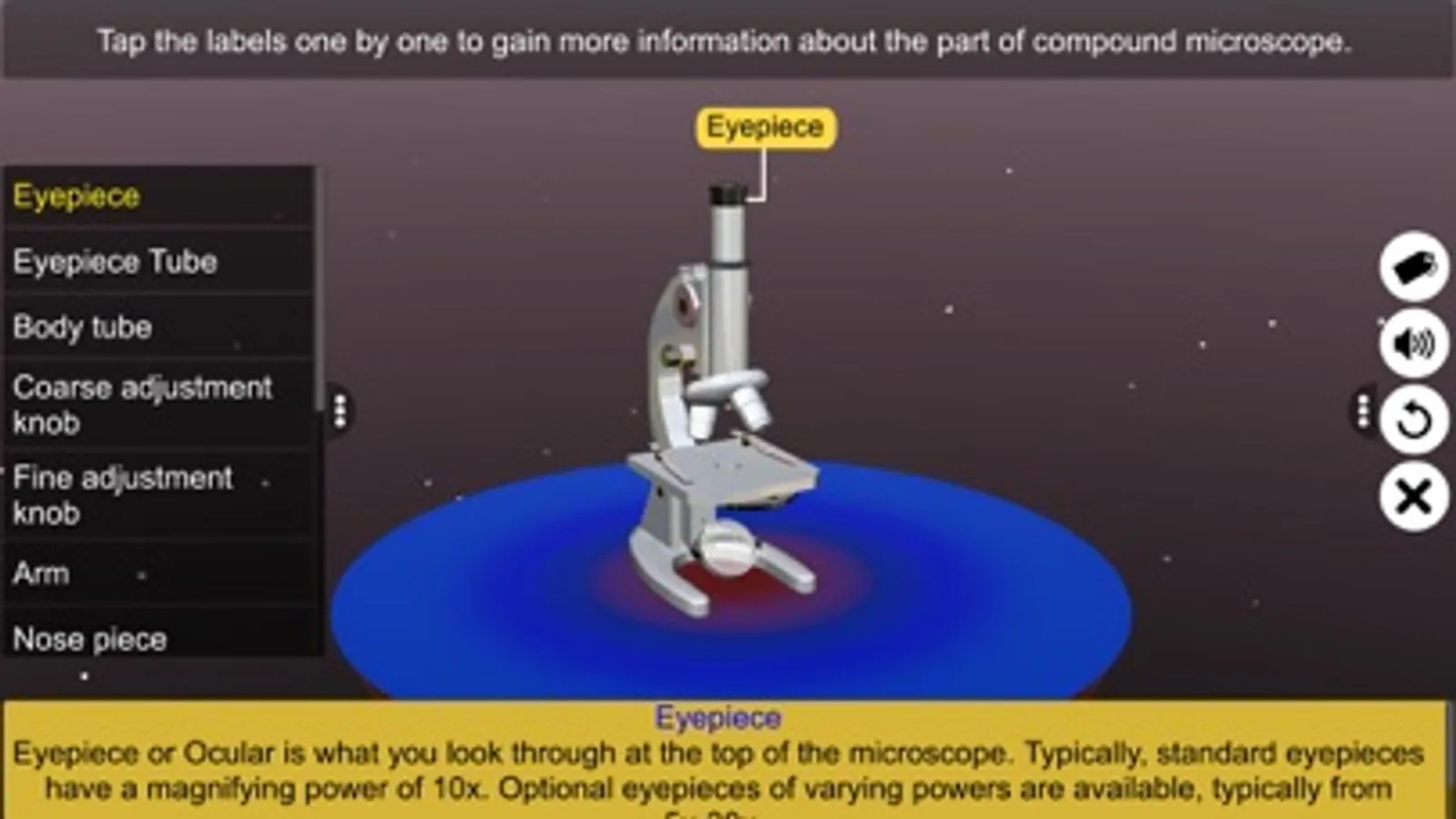 - Tap and Pinch Zoom - zoom into and identify about Compound Microscope.