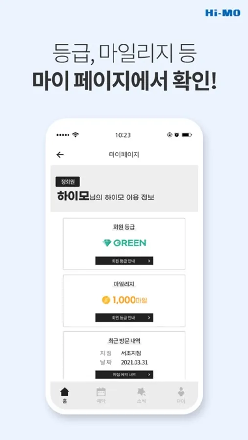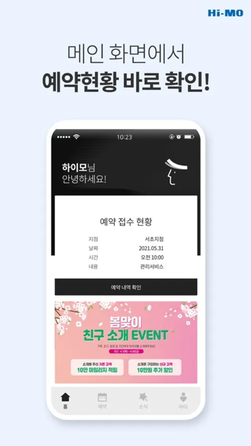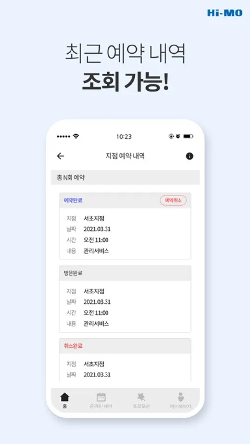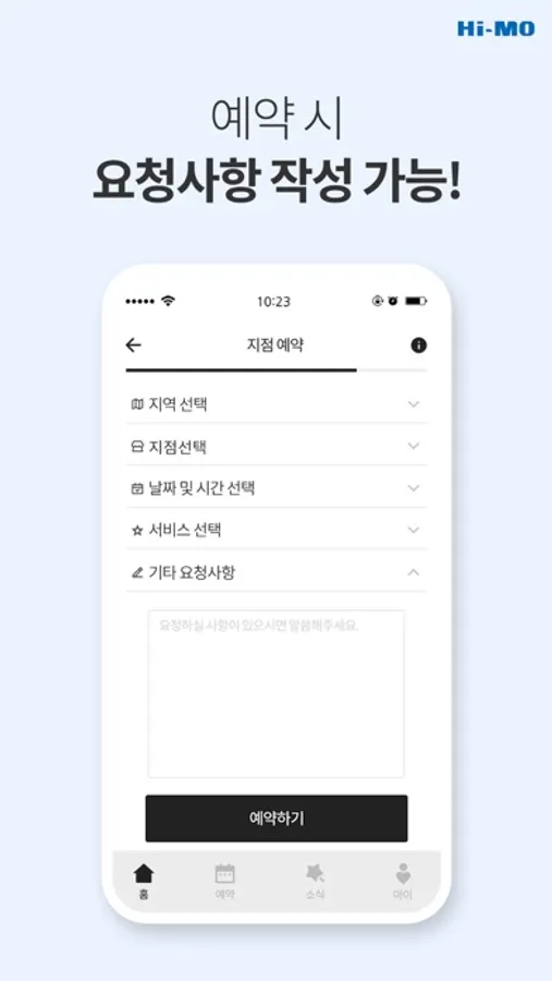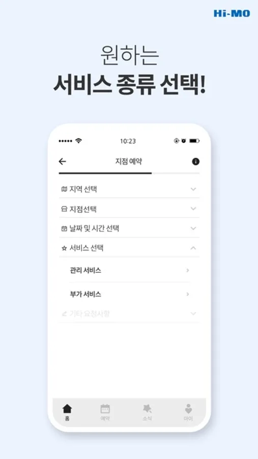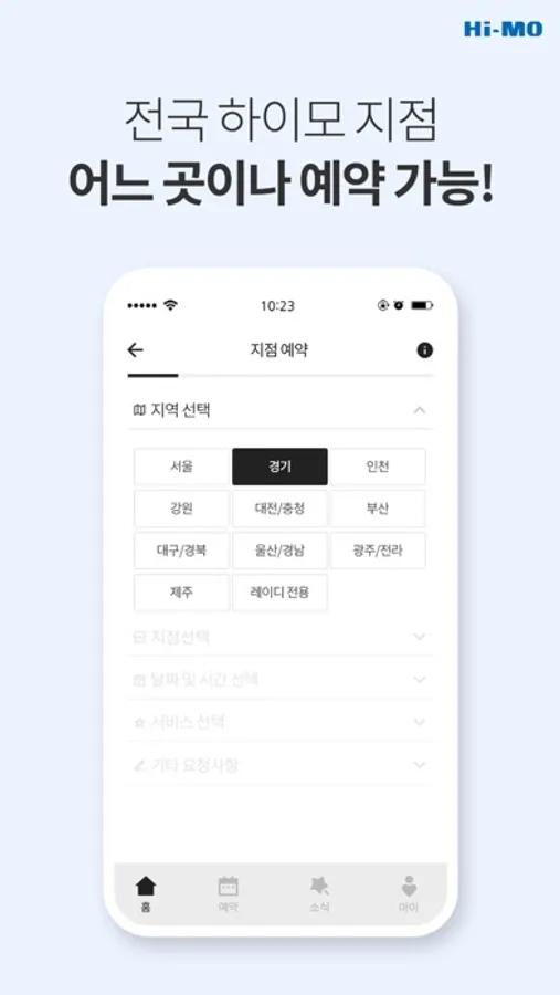 예약메뉴에서 지역, 지점, 날짜/시간, 서비스 종류를 선택하여 예약하세요.