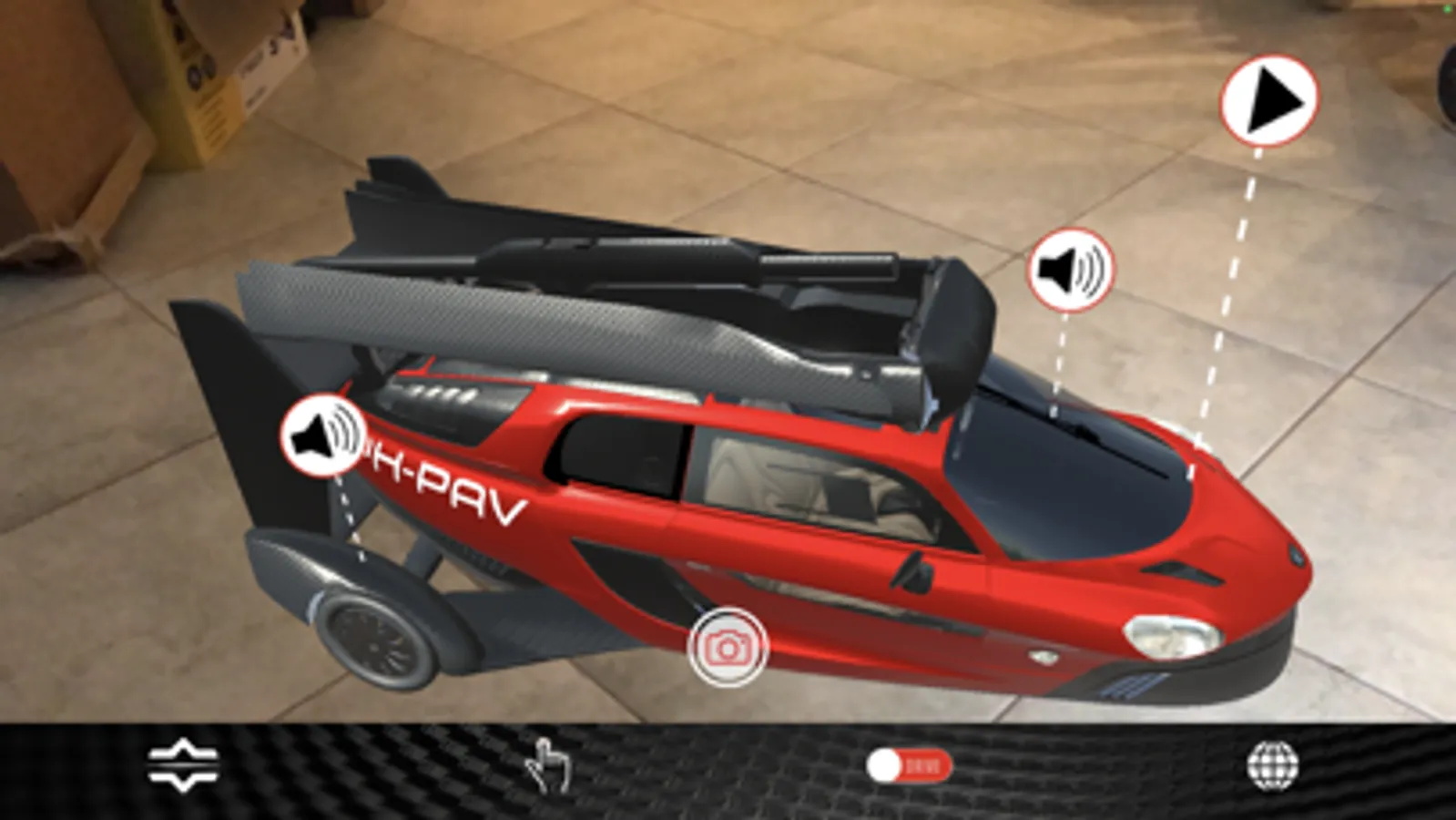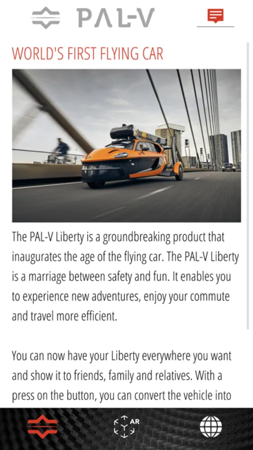 Augmented Reality app showing the PAL-V Liberty. The PAL-V is the worlds first flying car which you can visualize in AR in Fly and Drive mode. You can also read more information about the PAL-V Liberty.
