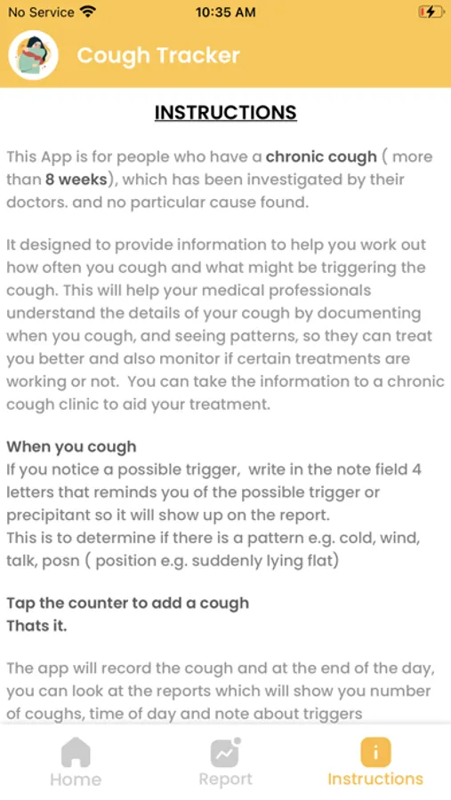 Take charge of your cough. Document the frequency and triggers for your cough so you can get better treatment. Sometimes it is hard for doctors to really appreciate the magnitude of a problem cough. Use this app for a short time so you can show your doctor the exact pattern of your cough - whether you cough once an hour or twenty times an hour, only in the morning or 100 times a day. A picture tells a thousand words.
