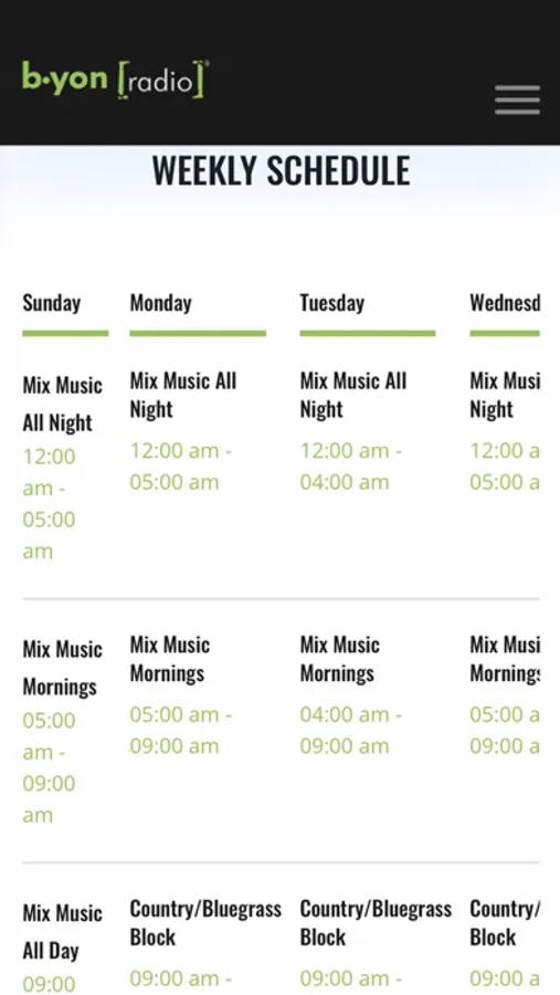 The b•yon [radio]® app lists weekly radio schedule for listeners to find blocks of music mix, rock, pop, r&b and country music. It spotlights featured artists, music videos and artist stories.