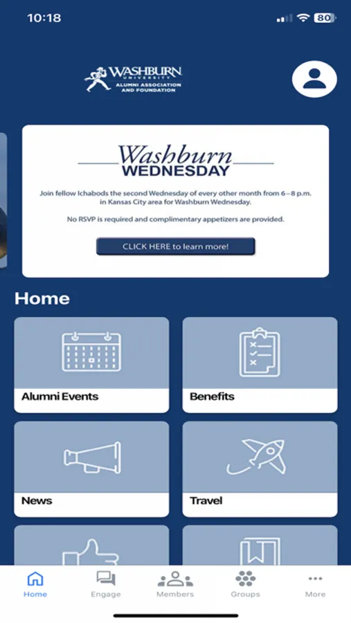 The Washburn Alumni app connects you to the Washburn Alumni Association and Foundation. Read up on news, travel opportunities, or Washburn alumni events near you. Members also can use their mobile membership card, access benefits and discounts and purchase a membership. Stay connected to Washburn University and remain forever an Ichabod.