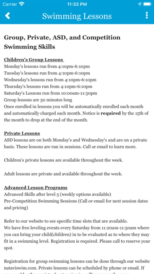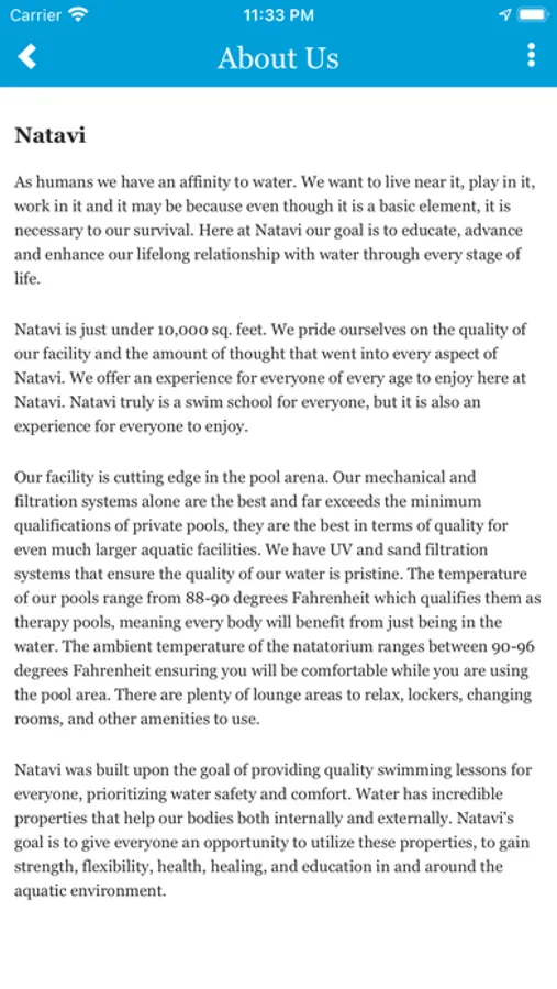 Natavi is a swim school for all ages. Natavi offers swimming lessons for adults and children as well as offers adaptive swimming lessons. Water Aerobics, Water walking/lap swimming, family swim, Yoga, Aqua Meditari ™ and Boga Pilates are also offered.