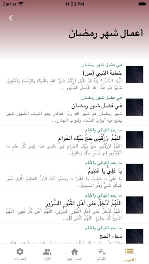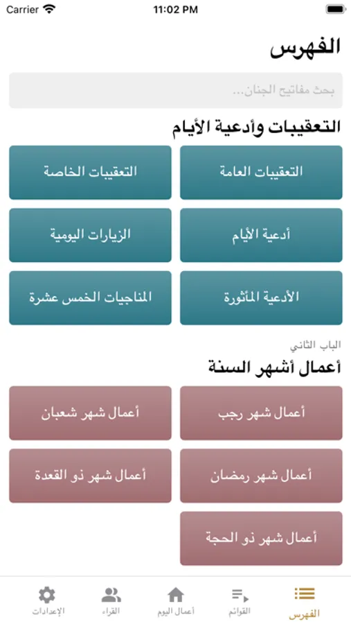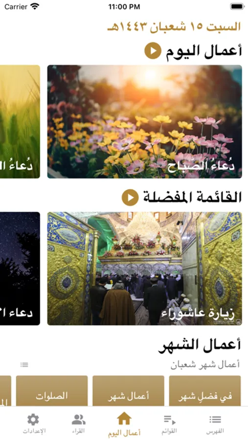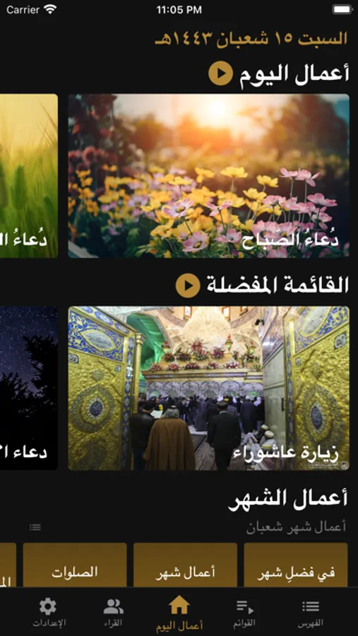 * قائمة بالأعمال اليومية (دعاء الصباح، دعاء اليوم، زيارة اليوم،…) في الشاشة الرئيسية.