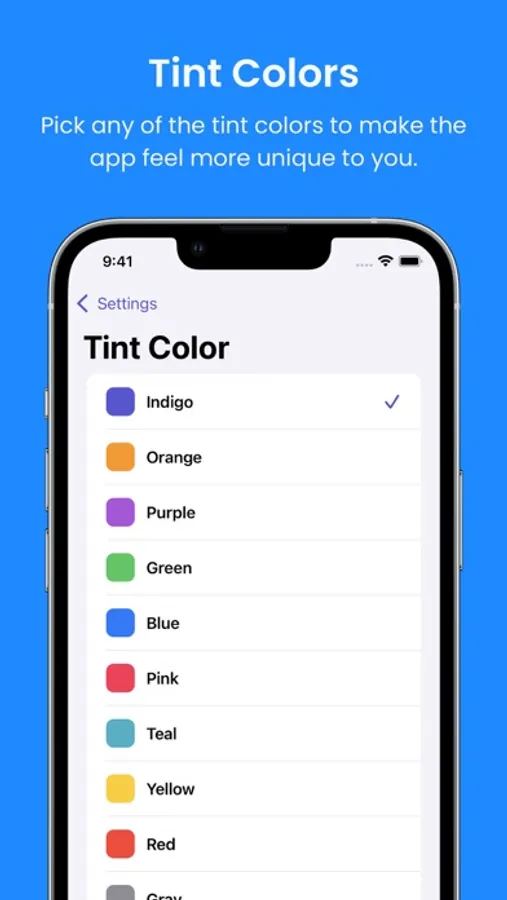 - 15 Different tint colors that will let you make the app feel more unique to you