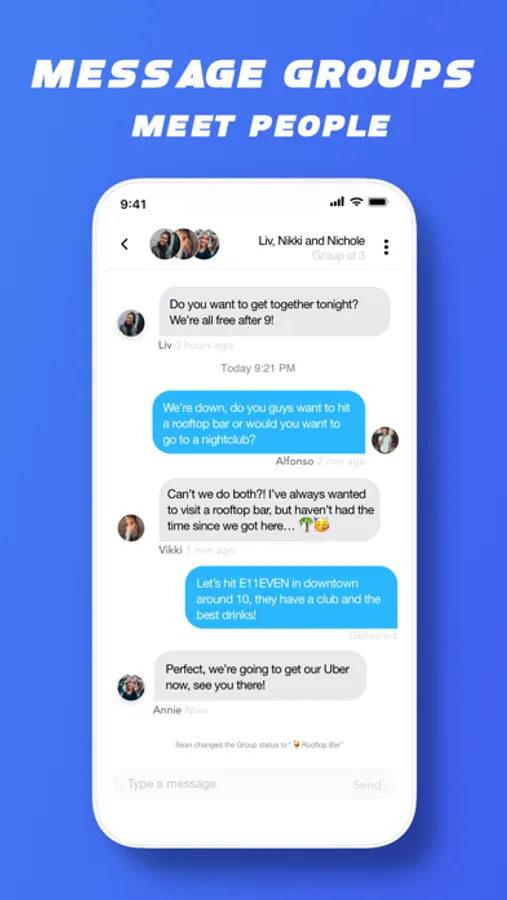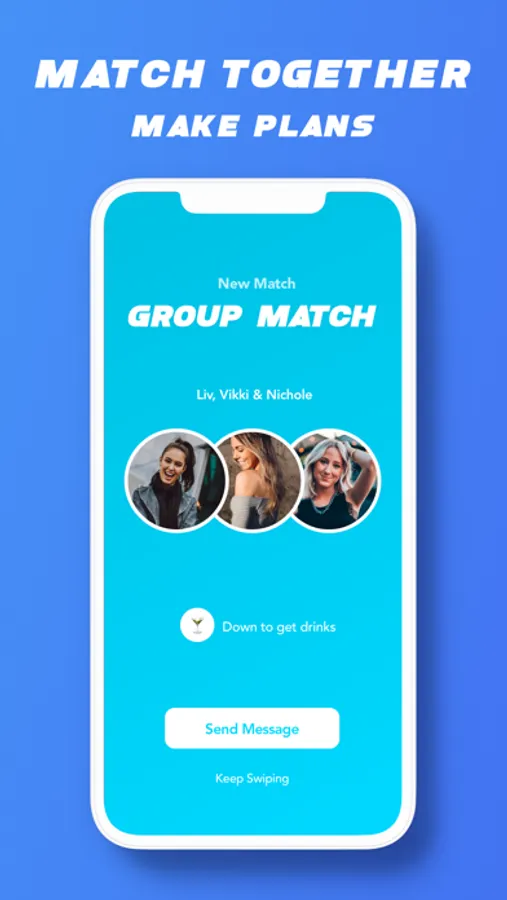 Set your status to share what you and your friends are up to — grabbing a drink together, watching the game, going dancing, you name it! If someone from another group Likes your group back, That’s a Match! You can now message them and hang out together.