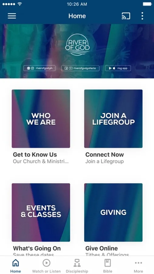 Welcome to the official River of God app! Download this app to be updated with our church activities, events, preaching, teaching, and discipleship content. Get access to all the services and event information, or give through mobile.