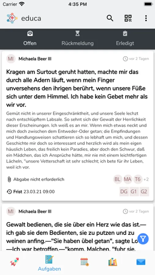 (Haus-)Aufgaben können komplett papierlos erstellt und bearbeitet werden. Lehrende erstellen dafür digitale Arbeitsblätter, konfigurieren optional die richtigen Antworten, definieren Fristen und weisen die Aufgaben ganzen Gruppen oder einzelnen Nutzern zu.