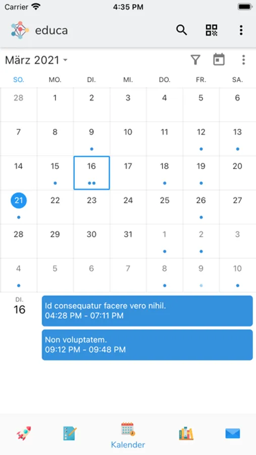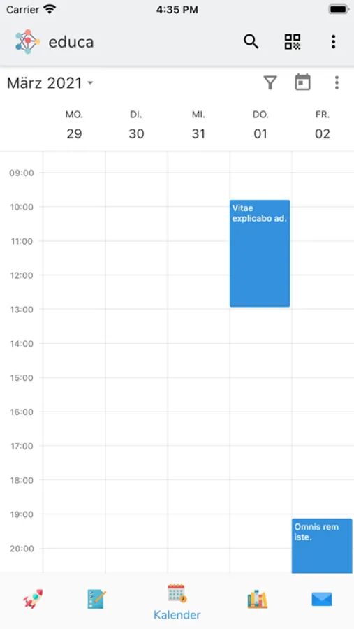 Ob Klassenstunde, Nachhilfeunterricht oder Nachmittagsprogramm – Termine bieten eine Basis für (digitale) Treffen und den termin-spezifischen Informationsaustausch: Protokolle und Dateien können verknüpft werden. Externe Teilnehmer können unkompliziert und sicher eingeladen werden. Schnittstellen zum Kalender von Outlook sind bereits integriert, weitere bauen wir gerne an (Webcal-Support).