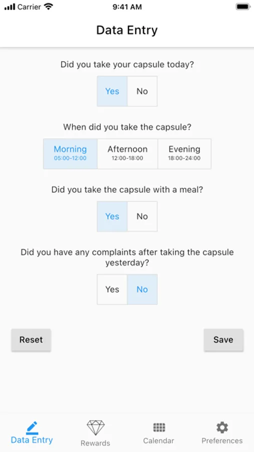 With the help of this app and short notifications, users are reminded daily to take the iron supplements. Four questions about capsule intake and possible side effects must be answered daily, and if present, the side effects should be specified. It is possible to adjust the entered information again on the same day.