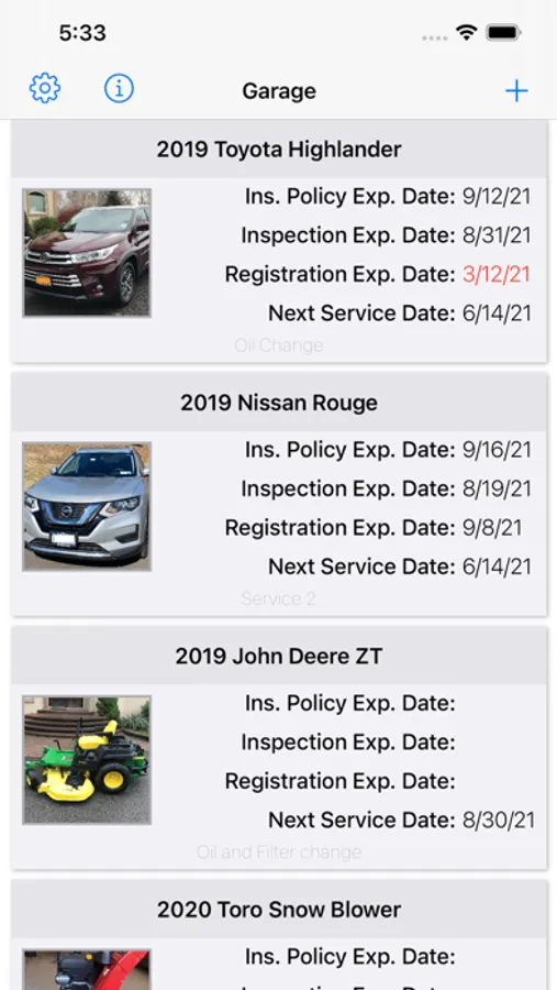 -Past important dates (e.g. Registration Expiration Date, Insurance Renewal) will appear in red to get your attention.