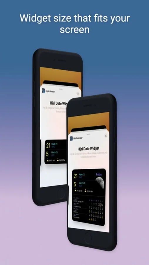 Great widgets that show Hijri & Gregorian dates, Pray times, Sunrise/Sunset times, Moon phases, and Calendar events.