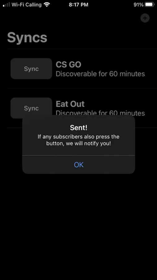 Using our app, one party won't feel discouraged if another party refuses. Because if one taps the "Sync" button, the other party won't know it unless the other party also taps the button within the specified time-frame. You can even create as many syncs as you like for different purposes: “Friday Happy Hours”, ”Sex”, “Eat out tonight”, etc!