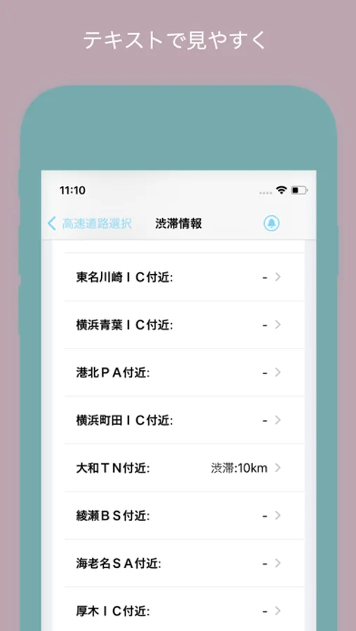 高速道路の種類を自由に選択して、テキスト情報で見やすく渋滞情報を確認できます。