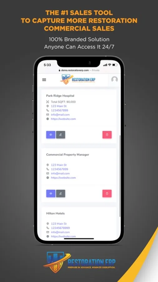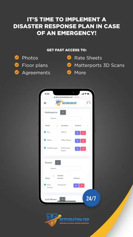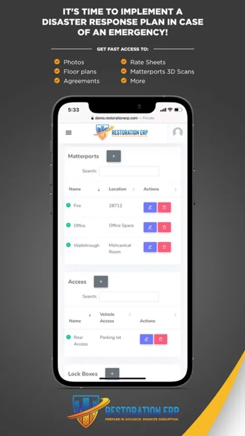 Restoration ERP brings your disaster plan online and is easily accessible from any device 24/7. Offer a disaster plan to your commercial clients for guaranteed future commercial restoration sales. Upload documents, photos, floor plans, Matterport 3D scans, vendor profile information and more. Help your commercial clients be prepared to minimize disruption.